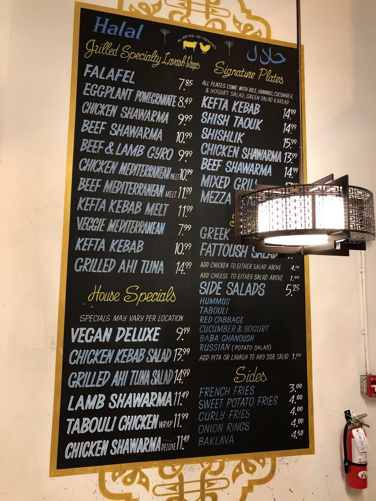 Seasoned sliced shawarma beef, hummus, Mediterranean salad, topped with tahini, wrapped in a lavash wrap.